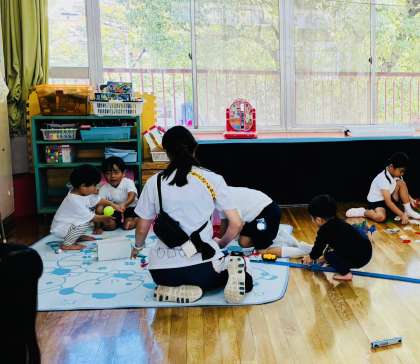 雨が降ったので、保育室で行いました。好きなおもちゃを見つけてすぐに遊び出す子、園児と一緒に遊ぶ子、人がたくさんでドキドキしている子など、小さいお友達もいろいろな姿がありましたが、しばらくすると、それぞれの子どものペースで楽しんでいました。帰る時間になり、もっと遊びたいと泣き出した子どもに大人たちが戸惑っていると、5歳児が手をつなごうよとそっと手を差し出すと、さっきまで泣いていた小さいお友達が安心したように泣き止み、帰る方向に歩き出す姿がありました。優しく寄り添う気持ちが伝わったのでしょうね。また一緒に遊ぼうね。