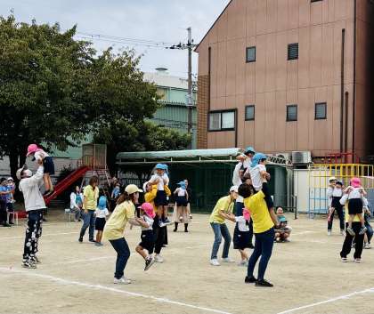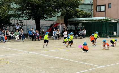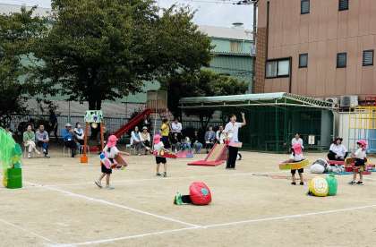 子どもたちが楽しみにしていた運動会。登園時からウキウキしている子どももいれば、いつもと違う園庭の雰囲気に、緊張している子どももいましたが、演技や競技が始まると、のびのびと楽しく取り組む姿が見られました。たくさんの拍手をいただいたことも、自信につながったようでした。最後までがんばり、首に金メダルをかけてもらった子どもたちの生き生きとした笑顔がとても素敵でした。ご協力ありがとうございました。