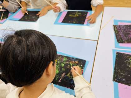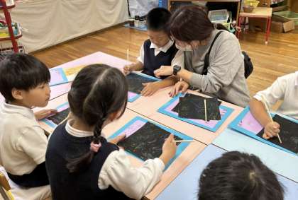 5歳児は、黒いところを削ったら虹色が出てくるスクラッチの遊びをしていました。いろいろなパスを塗り込んだ後、黒のパスを塗り重ねています。きれいな色が出てくるたびに、ニコニコの子どもたち。友達と嬉しそうに見せ合う姿も見られました。