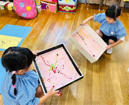 4歳児は、大きな箱に絵の具をつけたドングリを入れて転がすときれいな模様ができました。次は何色を使おうかなと自分で色を選び、繰り返し楽しんでいました。転がしながらドングリの歌を口ずさむ姿も見られました。