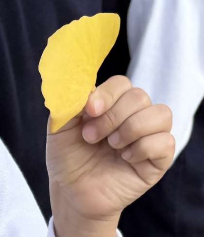 「いちょうのはっぱ」という題名の歌を歌っているので、黄色に色付いたイチョウの葉っぱが落ちているのを見つけて、とても喜んでいました。