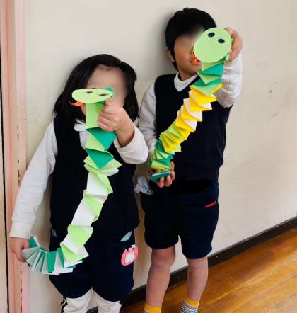 冬休みに入りましたが、預かり保育に参加の子どもたちは、今朝も元気に登園してきました。園庭でサッカーをしたり、先生たちと一緒に栽培物のお世話をしたりした後、保育室で来年の干支のへびをつくっていました。出来上がると嬉しそうに職員室に見せに来てくれました。