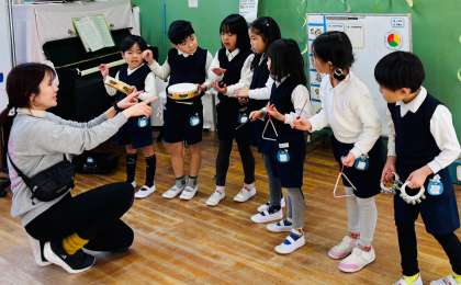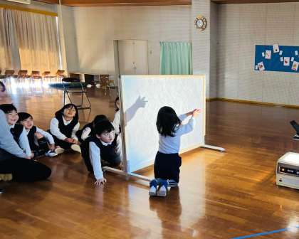 5歳児は、園庭でしていた影遊びを、室内でもできる道具があることを知らせると、さっそく友達と一緒に試していました。また、別の時間には、グループの友達と曲に合う楽器の打ち方を考えたり、見せ合ったりして遊ぶ姿がありました。それぞれのグループが考えた素敵なところを組み合わせると、とても心地のよい合奏になり、子どもたちも大喜びしていました。
