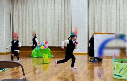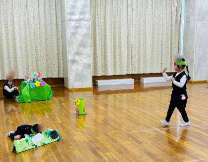 4歳児は、絵本「はらぺこあおむし」からイメージを広げて遊んでいます。絵本のストーリーのままではなく、自分たちが日頃遊びや生活で楽しんでいることを取り入れると、さらに楽しくなってきています。