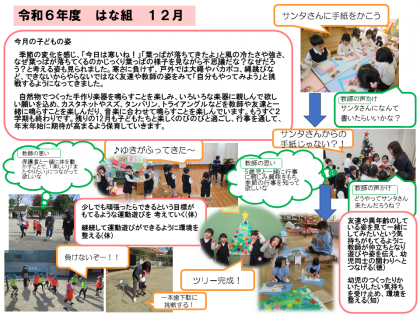 本格的に寒くなり、身近な自然の変化を感じとったり、サンタクロースと手紙のやりとりをして夢を広げたり…。楽しいことは、みんなでするともっと楽しい!と感じ、友達と一緒に過ごしたり、考えを出し合って遊んだりするようになった子どもたちの姿です。