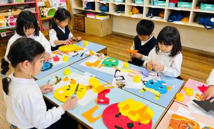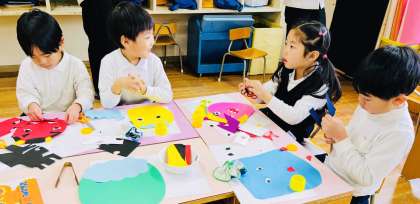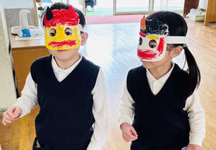 5歳児は、節分の話を聞いた後、自分でどんな鬼をやっつけるかを考えて鬼のお面をつくっていました。4歳児は、昨日つくったお面をかぶって、新聞を丸めた物を投げて、豆まきごっこをしていました。