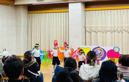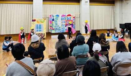 劇遊びや歌、合奏、ふれあい遊びなど、友達や先生と一緒につくりあげてきたことを発表しました。