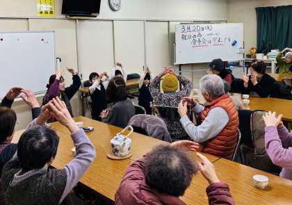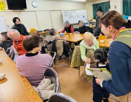 福祉会館で行われている食事サービスを5歳児からバトンタッチした4歳児が初めて訪問しました。ドキドキワクワクしながらし幼稚園を出発。会館につくと地域の方が笑顔で迎えてくださり、少しずつ緊張もほぐれて、のびのびと歌を披露したり、ふれあいを楽しんだりすることができました。