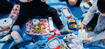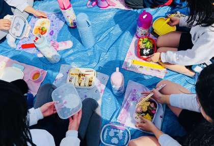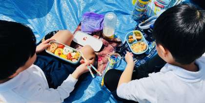 今日は、5歳児が幼稚園生活最後のお弁当の日でした。最後のお弁当は、4歳児も誘って園庭で一緒に食べました。子どもたち、とてもうれしそうに食べていましたよ。