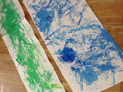 4歳児が絵の具遊びをして、芸術作品が出来上がりました。