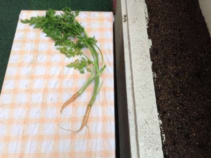 人参にならず、葉だけが大きく生長したものにも興味をもち、触ったり、葉のフサフサに気付いたりする様子をみて、遊びに取り入れてみました。楽しく遊んだ絵の具の跡を見て、満足そうな子どもたちでした。