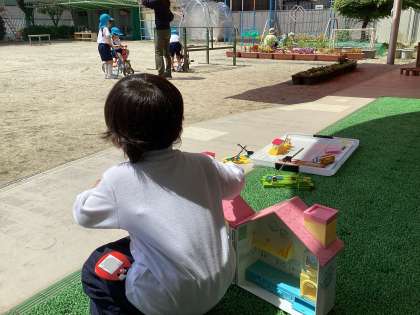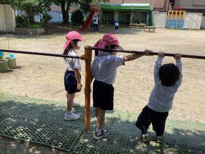 室内で遊び、気に入った遊具を持ったまま、園庭の様子も気にしていました。楽しそうに遊ぶ4、5歳児のお兄さんお姉さんを真似て、鉄棒にぶら下がると嬉しそうな表情を見せてくれました。