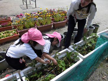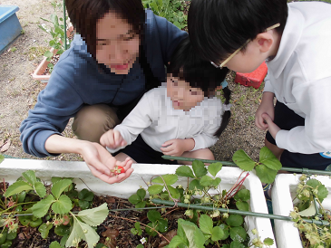 幼稚園で栽培しているいちごが赤くなり