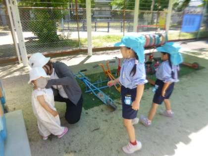 今日は、日差しも強く暑さを感じる日でした。未就園児さんも、色水を何度も汲んでは入れてを繰り返したり、水を流して溜まった泥水の感触を味わう幼稚園の子どもたちの姿を見て、少しずつ触れてみようとしたり、水を使った心地よい遊びを楽しんでいました。