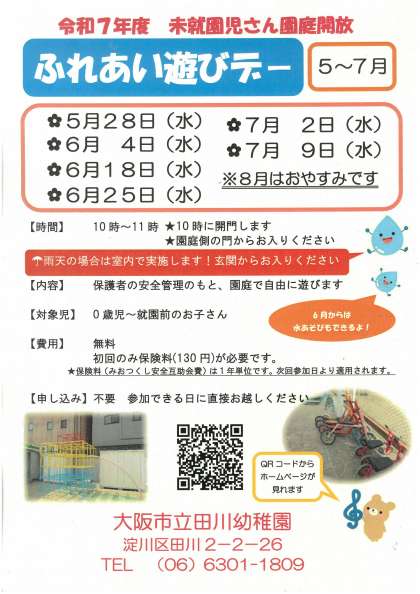 暑くなってきたので、園庭で水を使った遊びの場や涼しい室内遊びの場をつくってお待ちしています。0歳から2歳児のお友達がよく遊びに来てくれています。3歳児のお友達も大歓迎です。暑さ対策をして、少しなら濡れてもいいように準備してきてくださいね。