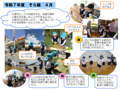 月ごとに、どのような子どもたちの育ちが見られたか、教師はどのような思いや願いをもって保育を進めていたか、幼稚園の教育活動を知っていただけるように、就学前教育カリキュラムを活用した配付物を作成しています。