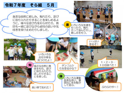 5月には、身近な自然を見たり触ったりする機会を多くつくり、子どもたちが興味をもったり、遊びに取り入れることを楽しんだりしていました。