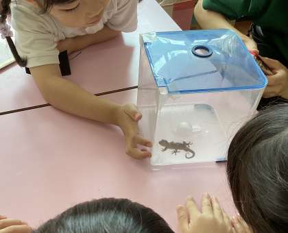幼稚園でヤモリを見つけました。図鑑で調べたり、何を食べるのかな?と話し合ったりして、「虫やで」「探しに行こう」と4歳児も5歳児も張り切って虫探しに出発しました。さあ、どうなるのでしょう、、、