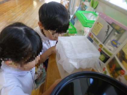 ヤモリが食べるものを考え「動いている虫がいいんじゃない?」となった子どもたち。一生懸命に探して捕まえた虫をケースに入れましたが…食べてはいませんでした。それを聞いた保護者の方々が「これなら食べるかも?」とミルワームを持ってきてくださいました。