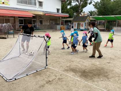 今年度初めてのサッカー遊びを、雨が降る前の園庭で実施できました。子どもたちから大人気のコーチの声掛けで、鬼ごっこ遊びから最後の試合まで、存分に動いて楽しみました。