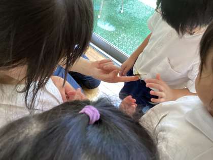 先週、プール掃除をした時に見つけたヤゴが、今日、何とトンボになっていました。気付いた5歳児が「うわ!」と声をあげてびっくり!すぐにみんなが集まって来て、生まれたてのトンボを興味津々な様子で見たり、触ったりしていました。貴重な場面に出合えました。