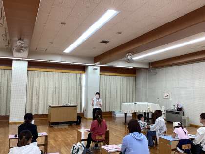弁当参観の後は、区の栄養士さんに来てもらい、「幼児期の食事について」の講話をして頂きました。また、お弁当のおかずになるヒントや苦手な食べ物を美味しく食べる料理の工夫も教えて頂きました。