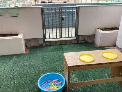 気温が上がり、暑くなってきました。園庭には水鉄砲、プール横のテラスにはシャボン玉を用意しています。保育室を涼しくしているので、室内でも遊べます。地域の未就園児の皆さん、是非遊びに来てくださいね。お待ちしています。