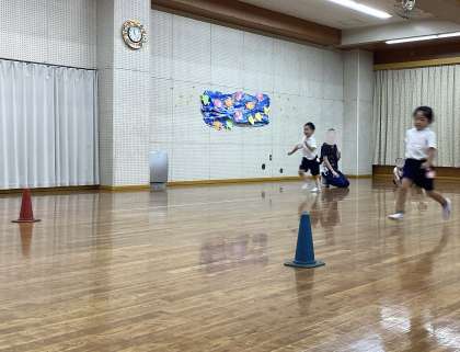 今日もプール日和となり、広いプールで伸び伸びと遊んだ子どもたち。日に日に体力もついてきて、プール後の休息が終わると「プレイルームで遊びたい」と大張り切りでした。「よーい、どん」と繰り返し走って、元気いっぱい楽しみました。