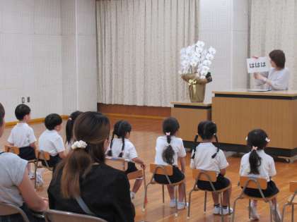 歌を歌ったり、1学期の遊びを振り返ったり、長い夏休みを元気に過ごせるようにお話を聞いたりしました。