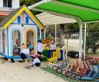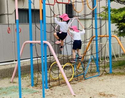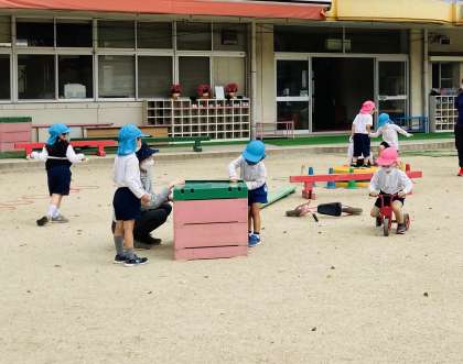 天気が回復し、広い園庭で年長児と昨日入園した年少児が一緒に遊びました。