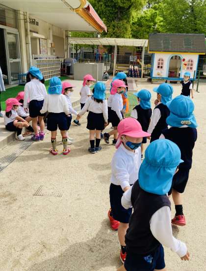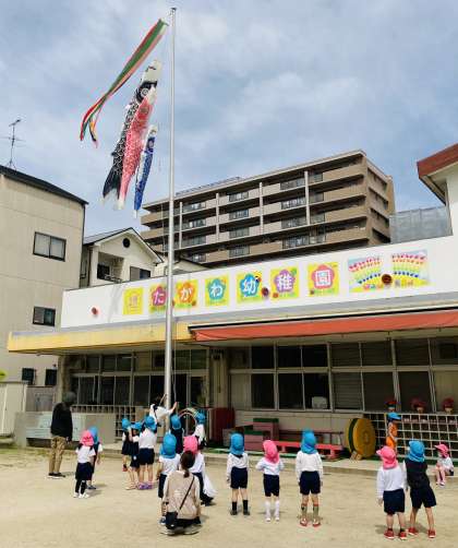 年長そら組が、年少はな組を誘って一緒に体操をしました。その後、こいのぼりをあげました。