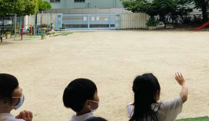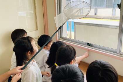 子どもたちは、ちょうちょおうちに帰りたいと思う、捕まえて外に出してあげたいと指先でツンツンしたり、網を取ってきて捕まえようとしたり、いろいろと考えて試みましたが、なかなか捕まりません。最後は、年長児が手で捕まえて広い園庭に逃してあげました。