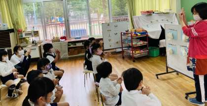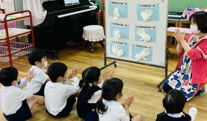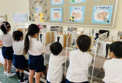 養護教諭が手洗い指導をしました。紙芝居で手洗いの大切さを知らせた後、手のどの部分を洗うのかを意識できるよう視覚的教材を使いながら子どもたちに知らせていきました。丁寧な手洗いが定着するよう、繰り返し指導していきます。