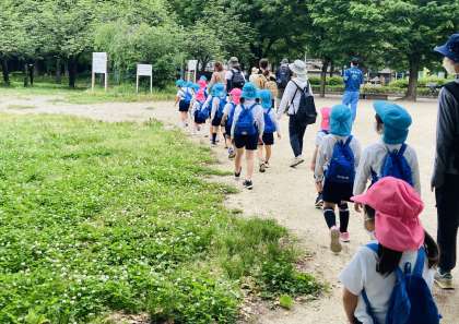 今年度初めて園外に出かけました。道の端を歩くこと、横断歩道では安全確認をして手を上げて渡ることなど知らせながら公園まで歩きました。子どもたちの安全見守りに淀川区セーフティーさんも一緒に行ってくださいました。