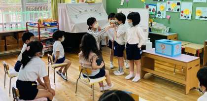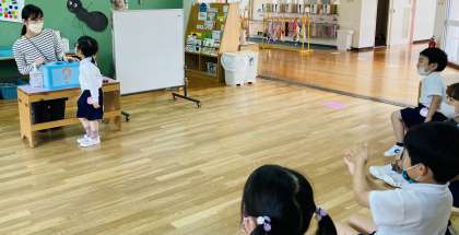 まずは、はてなボックスに野菜を入れます。そして何の野菜が入っているかわからない状態で子どもが触り、気付いたことをクラス全体に伝え、クラスみんなで何の野菜が入っているかを当てる遊びをしました。