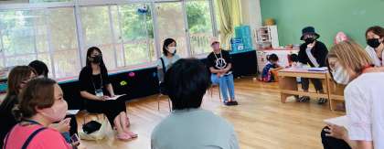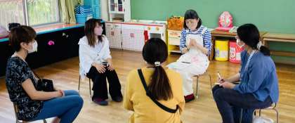学級懇談会では、PTA学級委員が司会をして、自己紹介をしたり、進学に向けて気になることや、食育についての情報交換をしたりしました。幼稚園からは、ビーズと輪ゴムを使って簡単につくれる補助箸を知らせ、その場で一緒につくりました。その後、感染対策をしながらの子どもたちの弁当の様子を参観してもらいました。