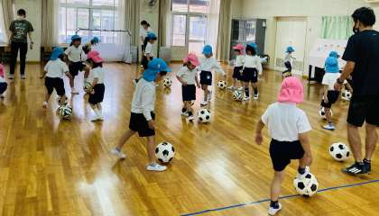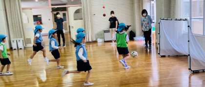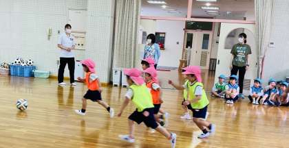 はじめはコーチと鬼ごっこをして心も体もほぐしていきます。次にひとり1つずつボールを使ってボールに親しむ遊びをし、最後はチームに分かれて試合をしました。友達と一緒に体を動かして遊ぶ楽しさを存分に味わうことができました。
