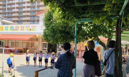 今週は、異年齢活動のミックスジュースチームであいさつ隊をしました。5月に5歳児があいさつ隊をしている姿を見ていた4歳児は、今回一緒にできることを楽しみにし、5歳児は4歳児のお手本になろうとはりきっていました。