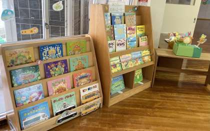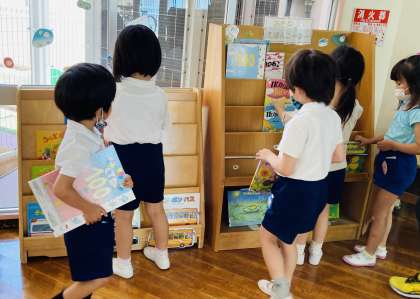 先日園庭にいたカタツムリの話題から、新しく購入したカタツムリの絵本の話につなげ、そこから虫のシリーズの絵本、その他いろいろな絵本の紹介をしていきました。「わぁ、読みたい!」「いっぱいある」と子どもたちは目を輝かせて聞いていました。しばらくの間は、保育室近くに新しい絵本のみのコーナーをつくることにしました。
