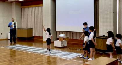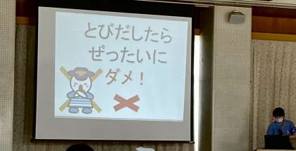横断歩道での安全確認、信号や標識についてのお話を聞いた後、プレイルーム内につくった横断歩道を1人ずつ渡りました。頭では右、左、右を見てから渡るとわかっているようでも、実際に渡るとなると、安全確認せずにすぐに渡りがちでした。日頃の生活でも気をつけましょう。