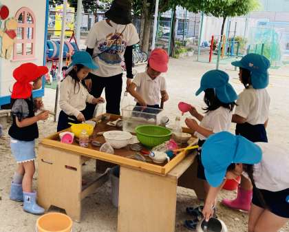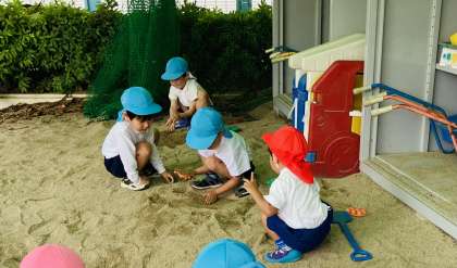 赤い帽子が未就園3歳児『うさぎ』のお友達です。今日からおうちの人と離れ指導員と過ごします。在園児のお兄ちゃんお姉ちゃんのしていることに興味津々で遊んでいました。