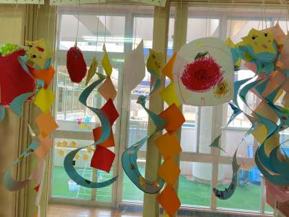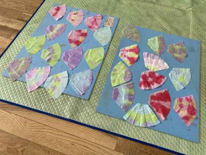 飾りづくりを通して、切ったり貼ったり色を塗り込んだり、いろいろなことを経験し、つくることが楽しくなってきました。今日は、コーヒーフィルターを使って染紙遊びをしていました。さて、乾いたら、これを使って何をつくるのかな?お楽しみに。