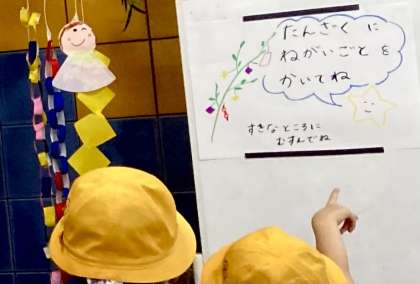 未就園の小さいお子さんに来ていただける時間を設けています。ゆっくり遊べるよう園児と時間を分けています。七夕のお願いもできるよう、短冊も準備しています。予約不要、雨天でもありますので、ぜひお越しください。