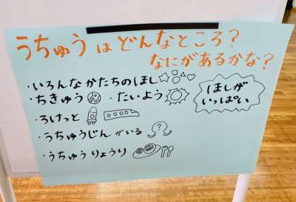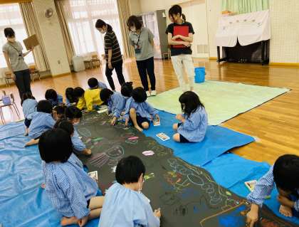 今日は、夜空や星に関心をもつようになってきた子どもたちと一緒に園児全体の支援をする教員が保育室ではできないダイナミックな製作活動を考え保育をしました。