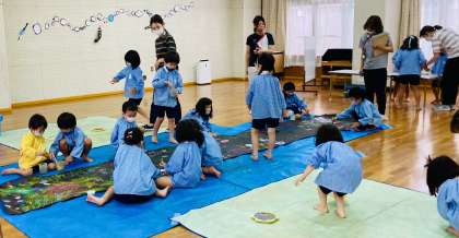 田川幼稚園の教員は、担任以外の教員もそれぞれの立場で1年に1回以上、研究保育を計画実施し、互いの保育を見合って声かけの仕方や保育内容など学び合ったり、保育後には討議会を行い保育を振り返ったりすることで資質向上に努めています。