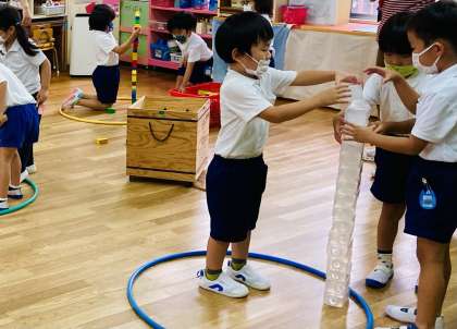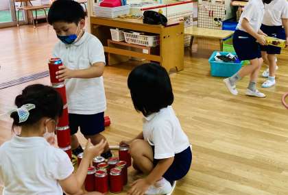 今日は、先日のPTA主催サマーフェスティバルの遊びから発展させて、いろいろな物を高く積み上げる競争で大盛り上がりでした。