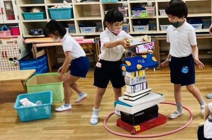 空き箱、ブロック、カプラ、空き缶、プラスチックの空き容器、何を積み上げるかは、チームの友達と相談して決めました。