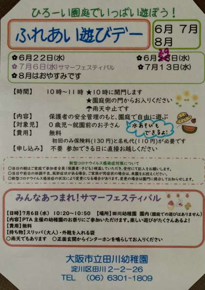 よちよち歩きの小さいお子さんの参加も歓迎です。着替えの服があるといいですね。帽子と水筒もお忘れなく。お待ちしています。