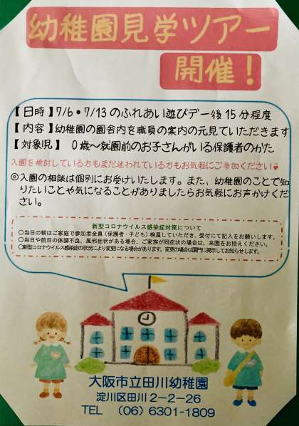 おはようございます。1学期最後のふれあい遊びデーです。幼稚園見学ツアーもします。
