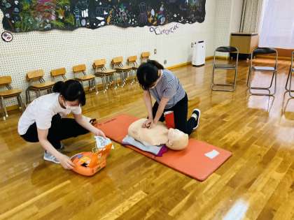 幼稚園は、たくさんの命を預かる場です。万一の時に、速やかに行動できるよう、幼児への心臓マッサージや幼児へのAED使用時の注意点などを学びました。